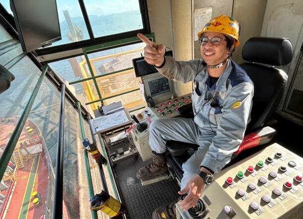 船内での重機操作や、フォークリフトを用いた運搬、合図・誘導など、スケールの大きな物流の最前線。