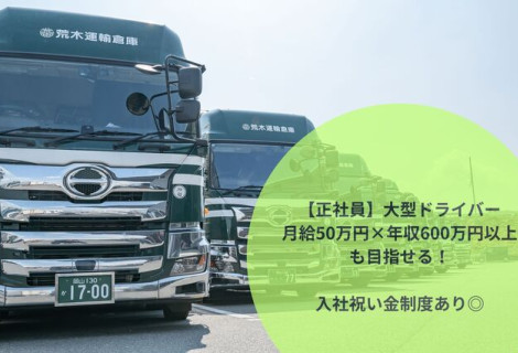 荒木運輸倉庫株式会社 長距離トラック運転手 大型ドライバー 岡山県 岡山市中区 ( 月給 ) 350,000円~ 500,000円 正社員 月給35万円~!年収600万円も目指せる/手積み手降ろしなし!マイカー通勤OK